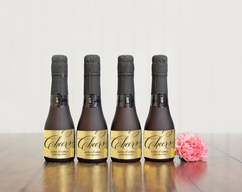 Personalized Mini Wine Bottle Labels - Wedding Favors Market Whether presented on an welcome table or at each place setting, your guests will love receiving a mini wine bottle favor with custom label. Features and facts: Personalized adhesive mini wine bottle labels (not waterproof) available in 4 designs: Chalk, Black Dots, White Dots, and Black and White Script