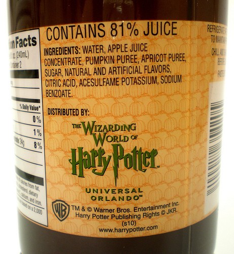 Harry Potter Pumpkin Juice Recipe - A Magical Drink For Halloween The label on the pumpkin juice bottle says that this juice contains water, apple juice concentrate, pumpkin puree, artificial flavors, and preservatives. Perhaps not the best ingredients list ever but with a few tweaks here and there you can make an even better version. How We Made Our Healthy Harry Potter Pumpkin Juice